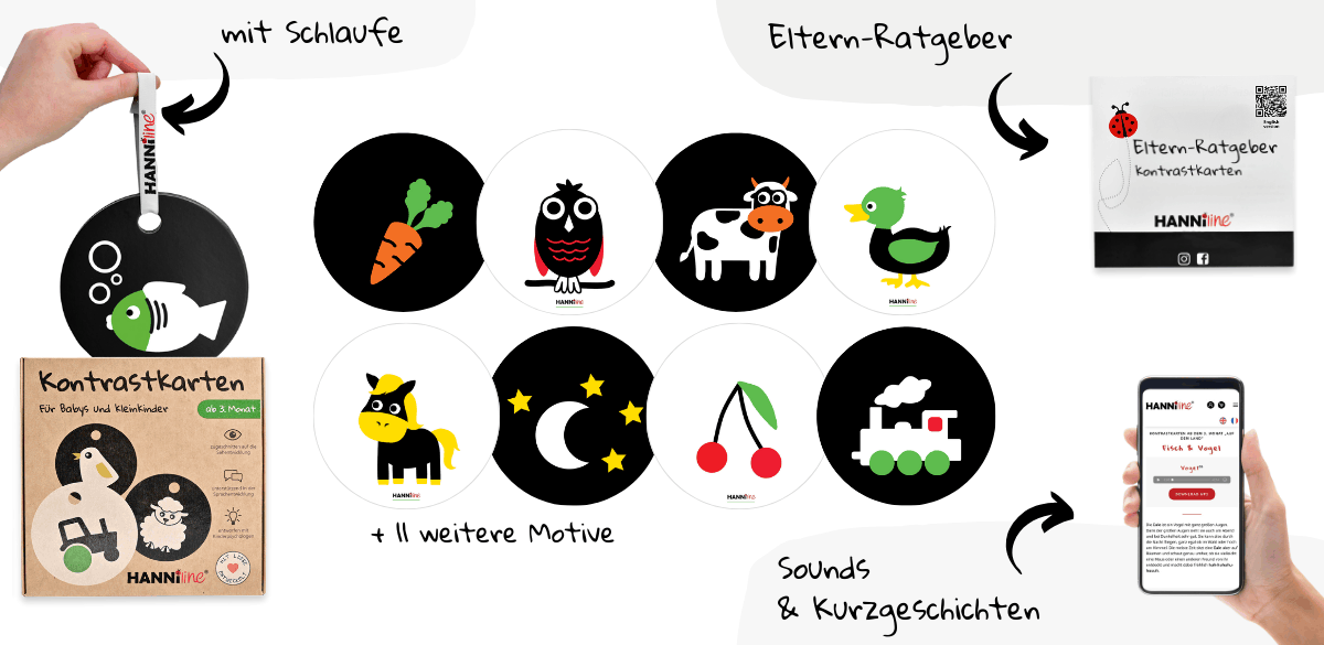 Mit den Kontrastkarten weckst du die Neugier deines Babys, unterstützt die neurobiologische Entwicklung, legst den Grundstein für die künftige Sprachentwicklung und stärkst dabei spielerisch eure Bindung. Sie sind ein Geschenk fürs Leben.