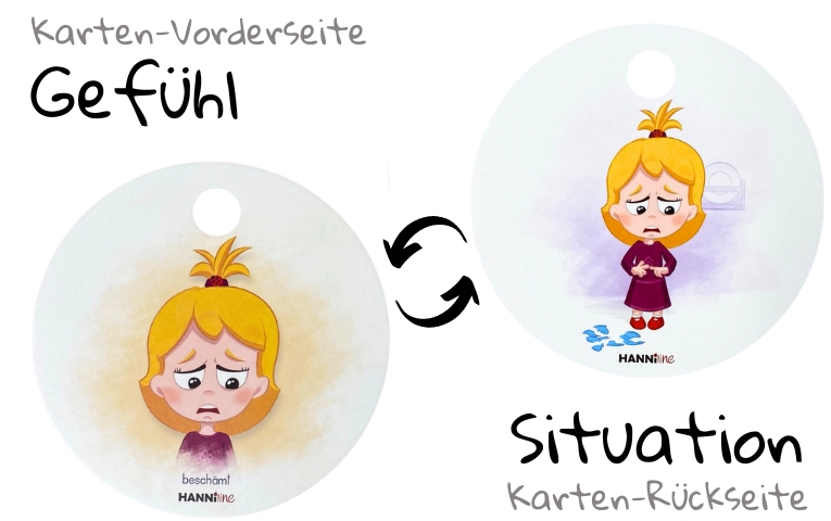 mit einem emotionalen Gesichtsausdruck auf der Vorderseite und einer klaren Beispielsituation, die das Gefühl ausgelöst hat, auf der Rückseite
