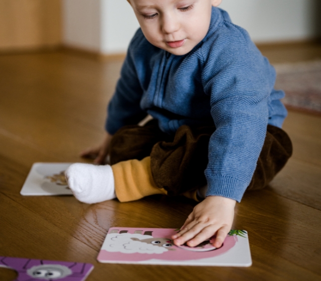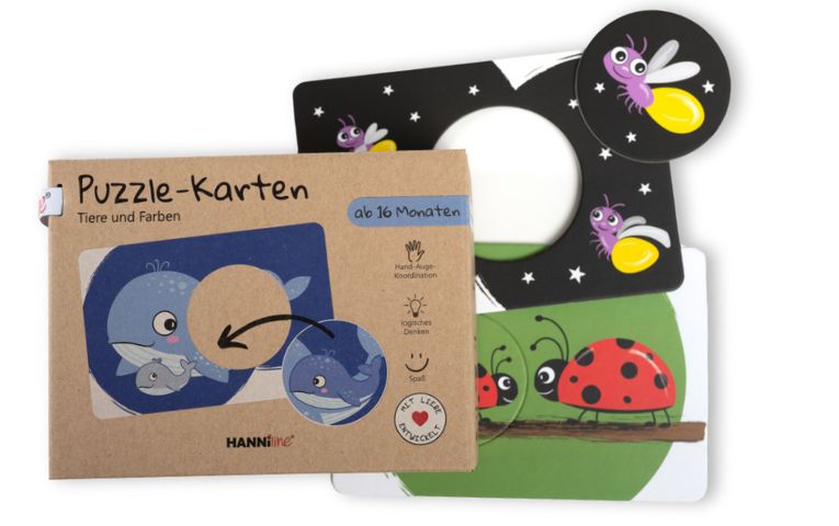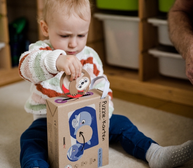 Schnappt euch einen runden Teil, seht ihn euch genau an und entscheidet, zu welcher Karte er passt. Nenne jeweils eine Farbe oder ein Tier und bitte dein Kind den gefundenen Teil in den seitlichen Schlitz der Verpackung zu stecken.